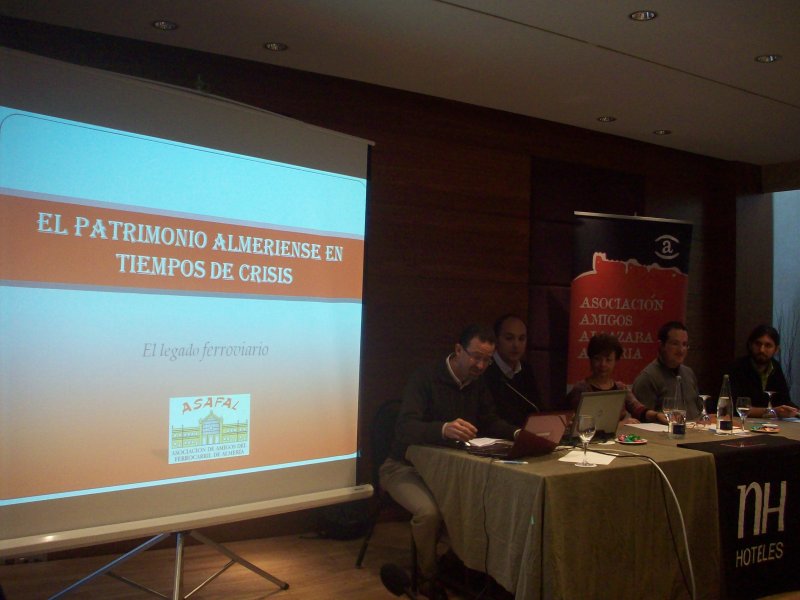 Durante el tiempo de intervenciones, ASAFAL presentó la comunicación titulada EL LEGADO FERROVIARIO, en la que se expuso el riquísimo patrimonio industrial-ferroviario que nos ha dejado la centenaria historia del ferrocarril en nuestra provincia y alertando del riesgo de deterioro, desprotección y expoliación que sufre actualmente. En este sentido, la exposición se centró en la recuperación como vía verde del tramo inicial del antiguo trazado del ferrocarril de Sierra Alhamilla – Almería que, siguiendo el ejemplo de Lucainena de las Torres (ha puesto en servicio 5 km. del viejo trazado de aquel ferrocarril minero), ha demostrado que este tipo de actuaciones, además de salvar el patrimonio ferroviario, fomentan el desarrollo económico y social de la zona que atraviesan.