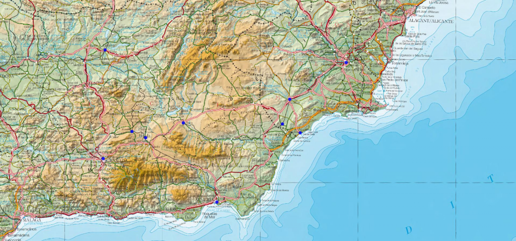 Cartografía de la red ferroviaria en el sureste de España en el área comprendida entre las provincias de Almería, Granada, Murcia y Jaen