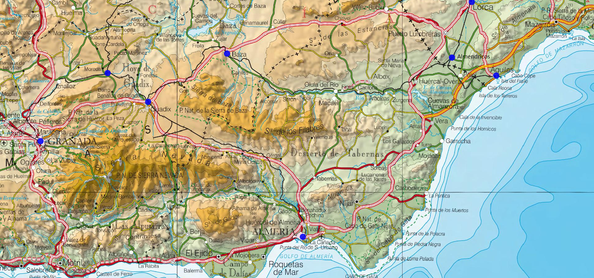 Mapas de conjunto del sureste de España con la provincia de Almería en el centro. Las líneas de ferrocarril en trazado negro continuo. Se han destacado en azul los principales orígenes y destinos y nudos de conexión de las diferentes líneas. Tramo Almendricos – Baza – Guadix clausurado y fuera de servicio desde enero de 1985Instituto Geográfico Nacional, ambos obtenidos del original a escala 1/1.000.000.