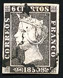 – 1850. 1 de Enero. Primer sello de correos de España. 1. 6 Cuartos. Negro. Reina Isabel II (1830 – 1904). Isabel II reinó de 1843 a 1868 y durante este periodo se produjo la implantación del Ferrocarril en España y su rápida expansión.