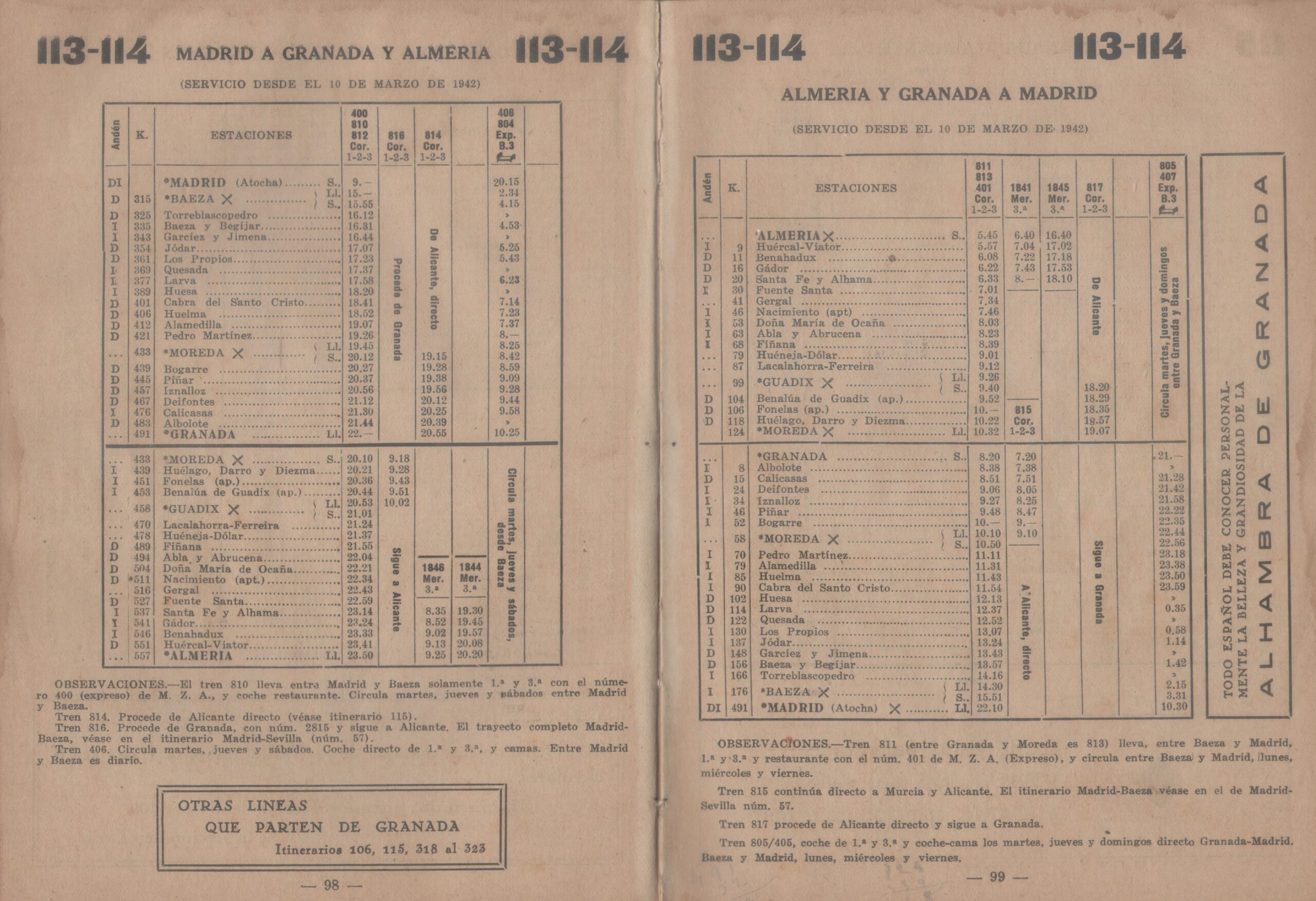 Los documentos que se reproducen están extraídos del Horario-guía de ferrocarriles – Servicio oficial, publicado el 1 de abril de 1942. Con un valor de 4 pesetas, era una publicación mensual con los horarios y tarifas de los ferrocarriles españoles que constaba de las siguientes secciones: