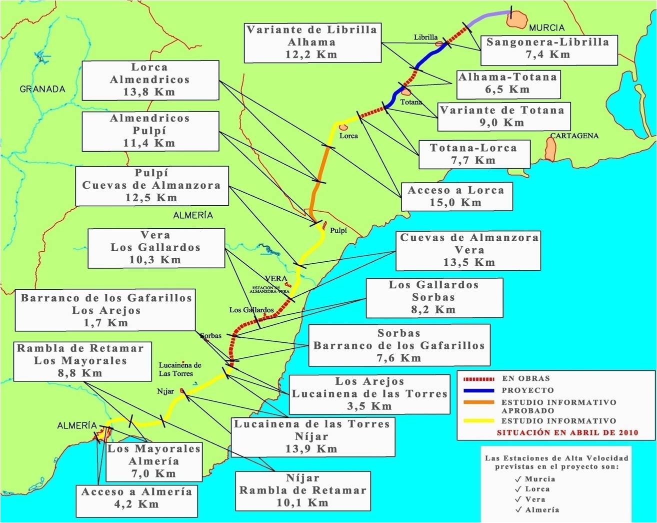 Las primeras obras se inician en el año 2003 en la Región de Murcia, mientras que en la provincia de Almería no comienzan hasta 2009. En 2013 se finaliza la construcción de un tramo de 27,8 km entre Vera y Los Arejos, quizás el de mayor complejidad de todo el trazado por atravesar Sierra Cabrera mediante túneles y viaductos de gran longitud. Ese mismo año, el Ministerio de Fomento decide tapiar las bocas de todos los túneles construidos y paraliza totalmente la ejecución del proyecto.