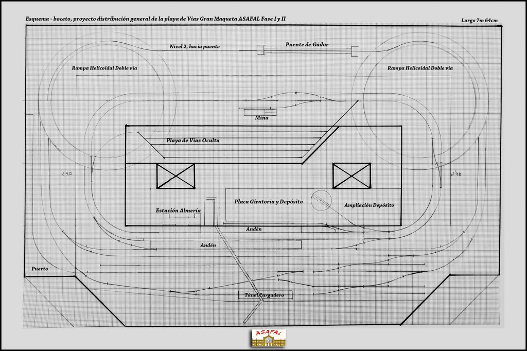 En la Asamblea de la Junta Directiva de Enero de 2017, se propuso hacer un boceto – proyecto de ampliación de la actual maqueta modular de ASAFAL, decisión positiva por parte de todos los asistentes, en la que incluiría un cambio apreciable en el diseño de la nueva maqueta, con el doble de módulos, haciendo claras referencias al Ferrocarril Almeriense, e intentar reproducir a escala HO el complejo Ferroviario del edificio de la Estación de Almería, su playa de vías, ( evidentemente reducida por las dimensiones del local ), placa giratoria, depósito, edificios anexos, elevaciones con rampas, puentes, viaductos, túneles, y en el nivel superior la recreación de la mítica estación de Doña María – Ocaña con su trazado en vía única, siendo este último nivel el más alto y el más sinuoso por la realización de dos rampas Helicoidales ocultas en los extremos del fondo de la maqueta en vía doble e intercalada al nivel 2 con vía única, en un pequeño trazado de túneles y reproducción del viaducto de los Millares o puente de Huéchar en Gádor, y salida en vía doble por rampa helicoidal, realizando un bonito recorrido por todo el trazado finalizando en la estación de Almería. Se basará fundamentalmente en la época de Renfe de los años 90, recreando todo tipo de señalización de la época. Se realizaría una pequeña ampliación en la estación (oculta ) de 4 vías que tiene en la actualidad a 8 largas vías con sus correspondientes desvíos eléctricos para la distribución de las diferentes y amplias composiciones.