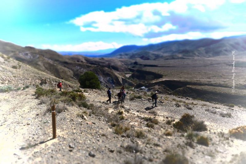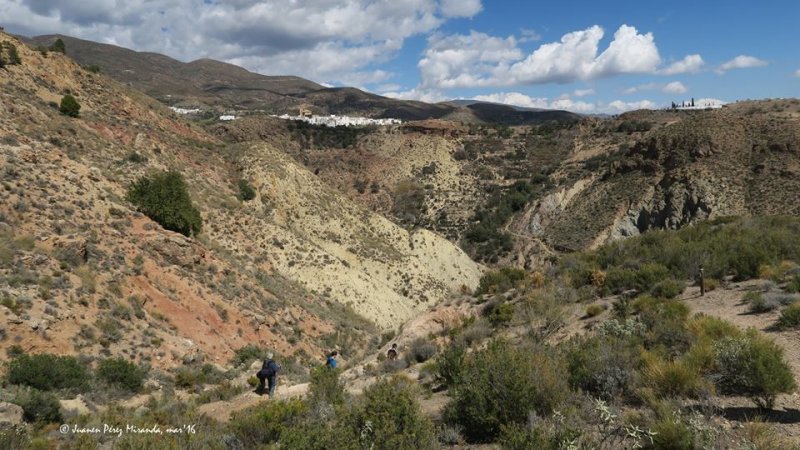 Empezamos la jornada tomando fuerzas en el bar del pueblo a primera hora de la mañana. El día estaba casi despejado y la temperatura ya completamente primaveral. Nos pusimos en marcha en dirección norte, enfilando hacia Beires, rodeando la ermita que comparten los tres pueblos cercanos, es decir, Beires, Almócita y Padules. Fuimos poco a poco ganando altura rodeando el Cerro del Capitán sobre el cual ya se empiezan a ver las primeras escombreras de los pozos y galerías aledañas. En cabeza de grupo expedicionario gozamos siempre de la alegre compañía de un animoso perro blanco cuyo nombre era Segundo, según nos comentó su propietario, Paco el del bar, a nuestro regreso a la plaza del pueblo cinco horas después. Segundo subió y bajó alegremente cuestas y barrancos aunque, (para nuestra sorpresa) lo hizo además portando una gran piedra en sus mandíbulas durante varios tramos del recorrido. A mitad de la ruta bebió algo de agua de nuestras manos y repuso fuerzas para seguir olfateando rastros y guiándonos en el camino de regreso al pueblo.