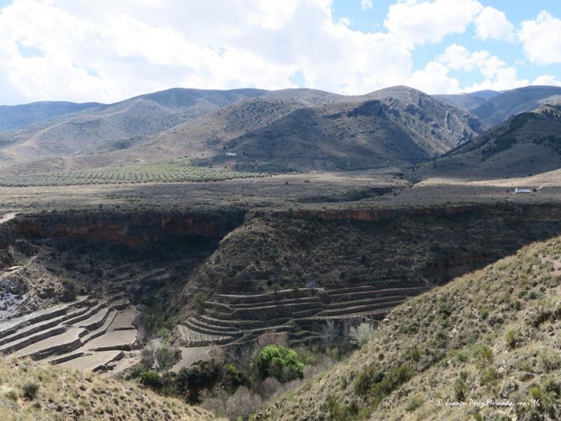 Conforme íbamos alejándonos de Almócita y ganando altura fuimos encontrándonos elementos del pasado como las caleras y los primeros pozos mineros, vallados muchos de ellos. Además, pudimos divisar los magníficos cañones en los encajonamientos del río Andarax. Desde luego, el terreno era inhóspito y seco, especialmente en los caminos por donde anduvimos, y la vegetación escasa, siendo la mayor parte del recorrido de matorrales. Observamos desde el punto más oriental del sendero vistas de la cara norte de las montañas de la Sierra de Gádor, los llanos que llaman de Cacín en la otra margen del río y otros pueblos de la zona como Fondón y Fuente Victoria. Es muy probable que, desde esta posición, el ingeniero de caminos José Trías Herráiz, autor del primer proyecto del ferrocarril de Linares a Almería (1874-1876), considerase muy acertado trazar el trazado de la vía férrea por el valle del Andarax hasta Fondón y, mediante una estación de retroceso, afrontar la divisoria de Sierra Nevada por el Collado de Tices para continuar por el río Nacimiento. Hasta muchos años después, en 1895, no circuló el primer tren de ancho ibérico por la provincia y, en ningún caso por los parajes que estábamos contemplando, sino por las estribaciones de la Sierra de los Filabres. Las expectativas de exportación del mineral de hierro pesaron mucho en el trazado definitivo del ferrocarril que hoy conocemos. Pero también hubo otros intentos de ferrocarriles económicos que pretendían discurrir por estos bellos paisajes montañosos: “El ferrocarril eléctrico secundario de vía de un metro entre Almería y Laujar, sin garantía de interés por el Estado”, cuyo autor fue Enrique Paniagua Porras, ingeniero militar de ferrocarriles nacido en Alboloduy. Desgraciadamente, nunca se llevó a cabo. Solo queda imaginarnos lo que hoy en día podría ser recorrer este trayecto desde el mar hasta la Alpujarra en un tren de vía estrecha.
